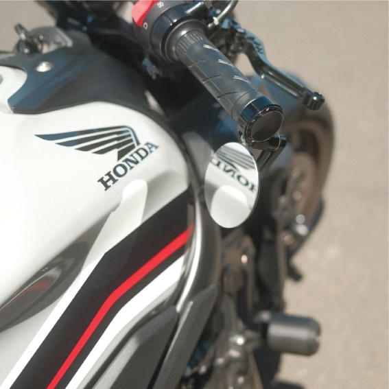 The mirror can be mounted both above or below the handlebar and is suitable for the right and left side. Mounting is directly on the end of the handlebar (22 mm and 1 inch) or if the grips and fittings can not be moved, using a mo.view bar adapter.
