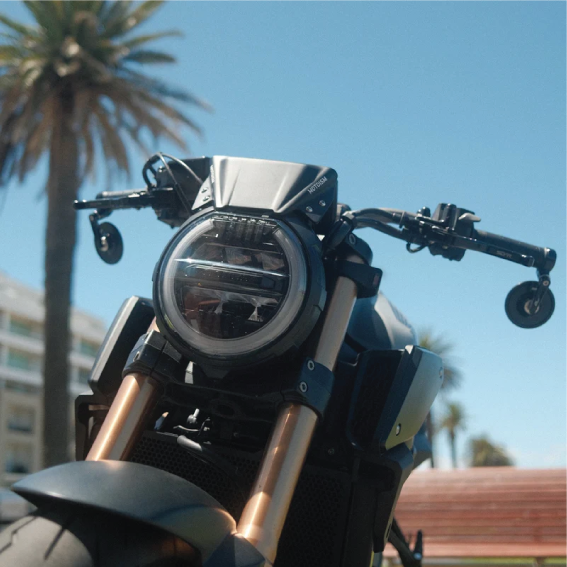 The handlebar end mirror can be mounted above or below the handlebar. The small arm can be swivelled. The mirror is suitable for the right and left side. Mounting is directly on the handlebar end (22 mm and 1 inch) or if the grips and fittings can not be moved, using the mo.view bar adapter.